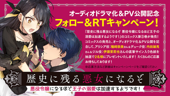 【応募期間終了】『歴史に残る悪女になるぞ 悪役令嬢になるほど王子の溺愛は加速するようです!』オーディオドラマ化記念! Twitterフォロー&RT色紙プレゼントキャンペーン